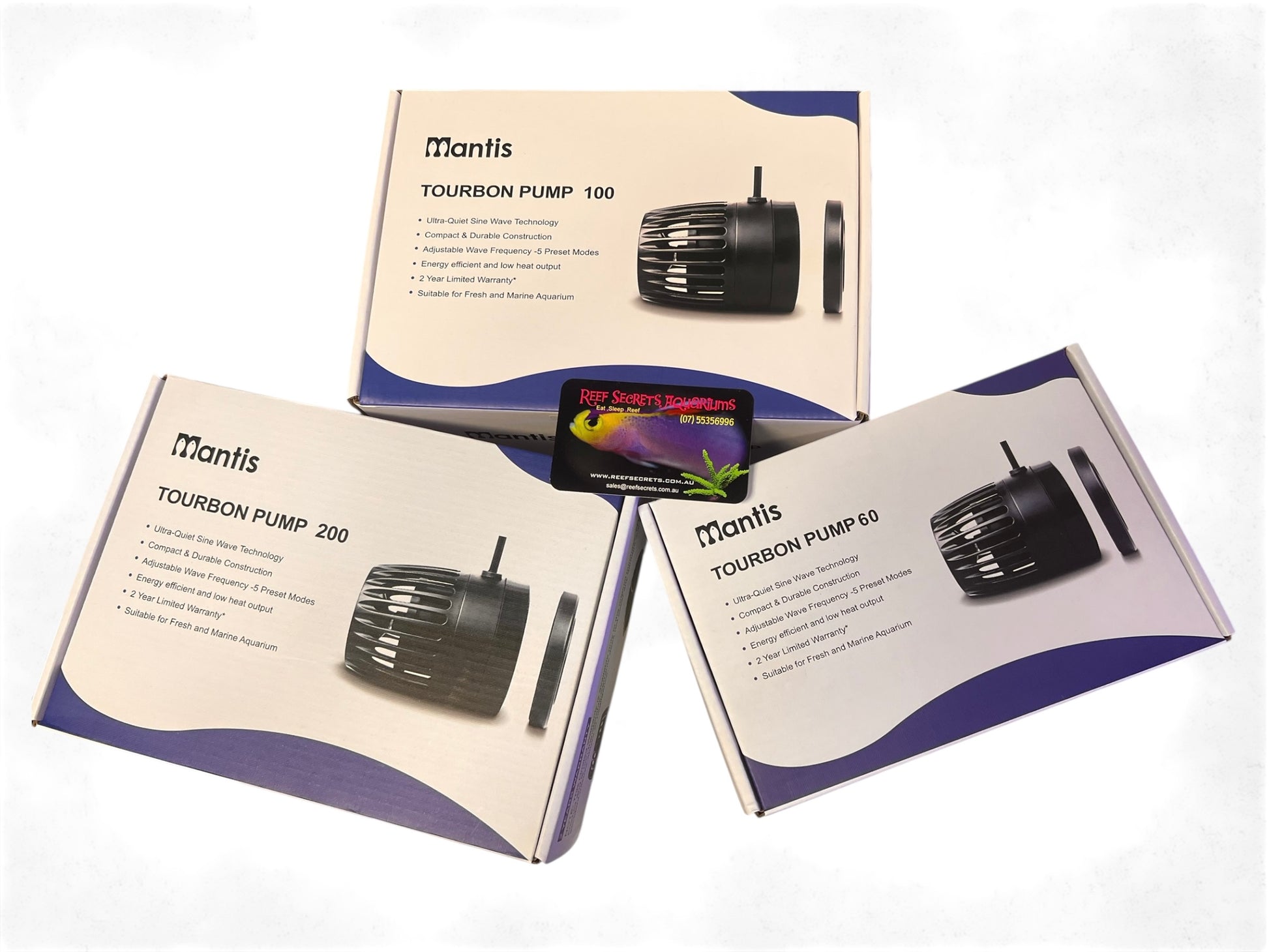 The Mantis Tourbon Pump series delivers customizable water circulation for aquariums of all sizes. Each model features sine wave technology that operates quietly while maintaining energy efficiency and minimal heat generation. Select from five flow modes—constant, stream wave, random, pulsing, and cycle—to match your tank's specific needs. Available in three capacities (60, 100, and 200), these pumps suit both freshwater and marine setups. Every unit includes a power supply, wet-side motor, controller, and mounting magnet, backed by a 2-year limited warranty. Choose the 60 for compact tanks up to 60cm, the 100 for mid-sized aquariums, or the 200 for larger displays requiring maximum circulation.