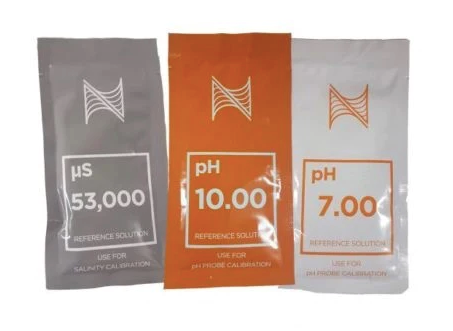 Calibration fluids for pH and conductivity/salinity probes.